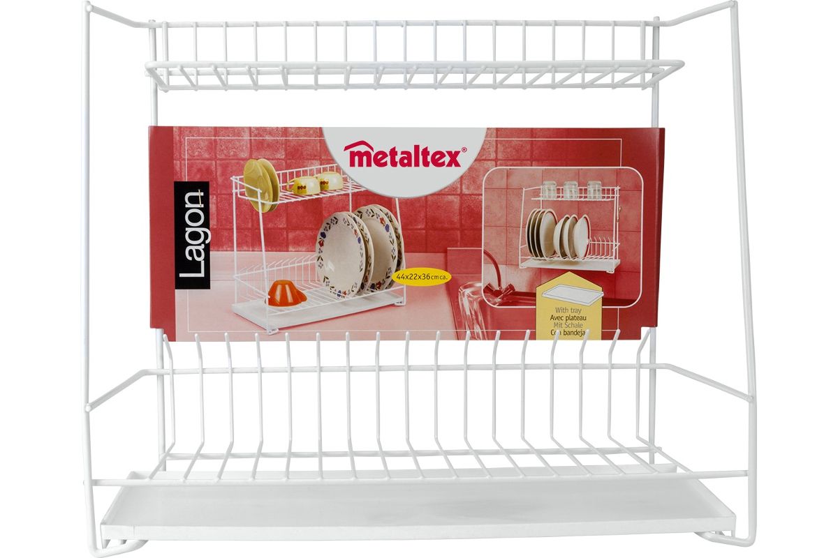 Двухуровневая сушилка ''Lagon'', выполненная из стали с политермическим влагостойким покрытием, представляет собой решетку с ячейками, в которые помещается посуда. У сушилки есть специальный пластиковый поддон для стока воды. Материал: сталь, пластик. Размер: 43,5 см х 22 см х 36 см.