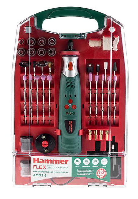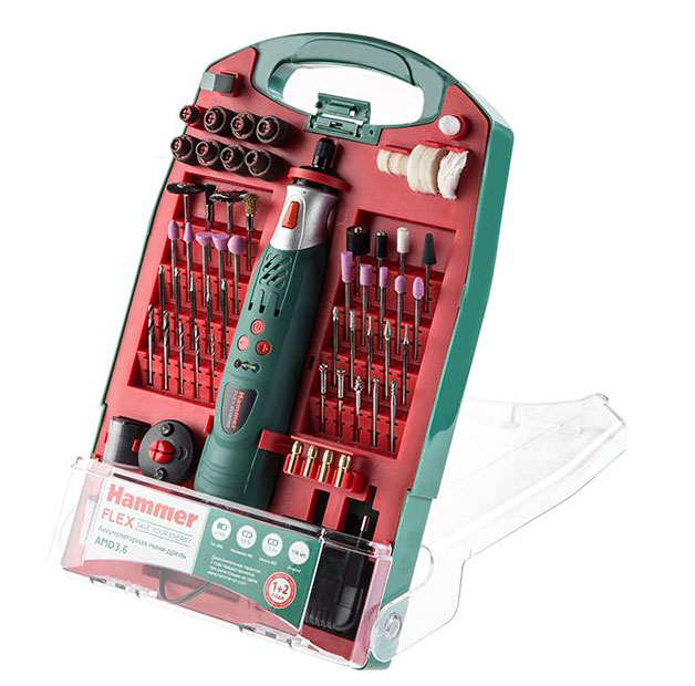HAMMER AMD3.6 – аккумуляторная мини-дрель для гравировки, сверления, резки, шлифовки и зачистки мелких деталей. Пригодится для мелкого домашнего ремонта, рукоделия, моделирования и другого DIY-хобби. В наборе 118 насадок.
