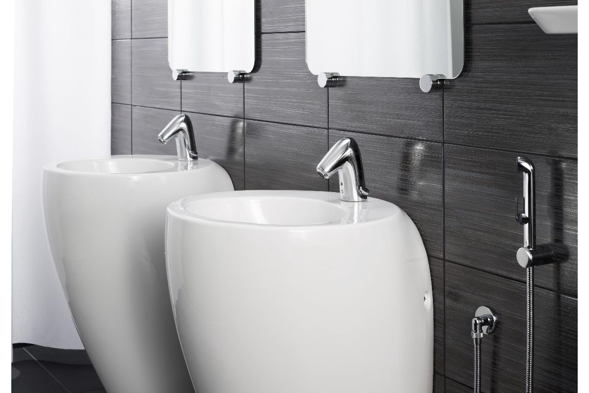 Бесконтактный смеситель для умывальника с рукояткой регулировки температуры и донным клапаном. Работает от батареи 6 В. Смеситель укомплектован грязевыми фильтрами и обратными клапанами. При установке смесителя не требуется настройка его параметров, поскольку в нем используется улучшенный датчик с системой автофокуса. Клапан с импульсным управлением обеспечивает длительный срок службы батареи. Ограничитель потока (6 л/мин) уменьшает расход воды. F = гибкая подводка.