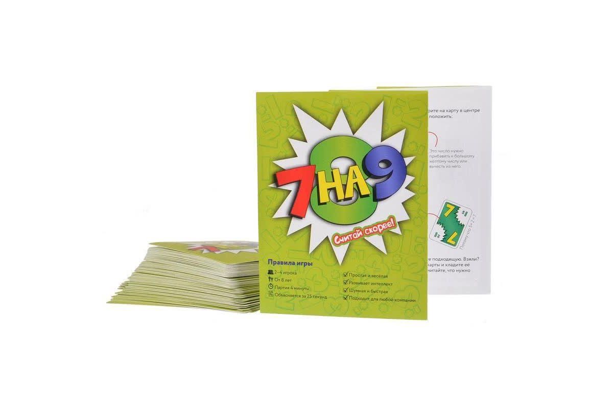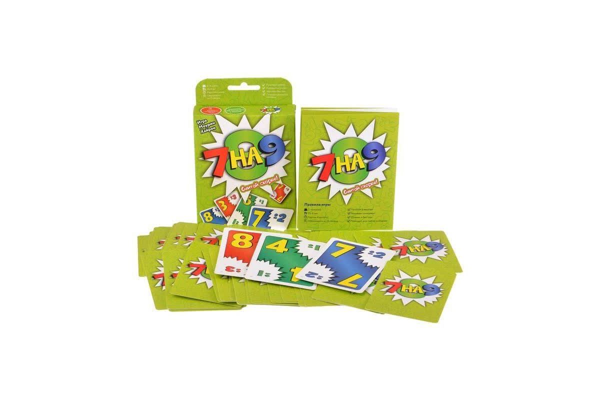 ''7 на 9'' - быстрая игра на сложение и вычитание. Играть очень просто: нужно быстро считать и класть подходящую карту. Очерёдности хода нет, все действуют одновременно. Кто первый избавится от карт, побеждает.